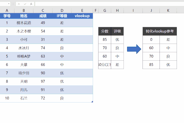 我们就用vlookup的近似匹配,就能把分数归类到对应的档位中。